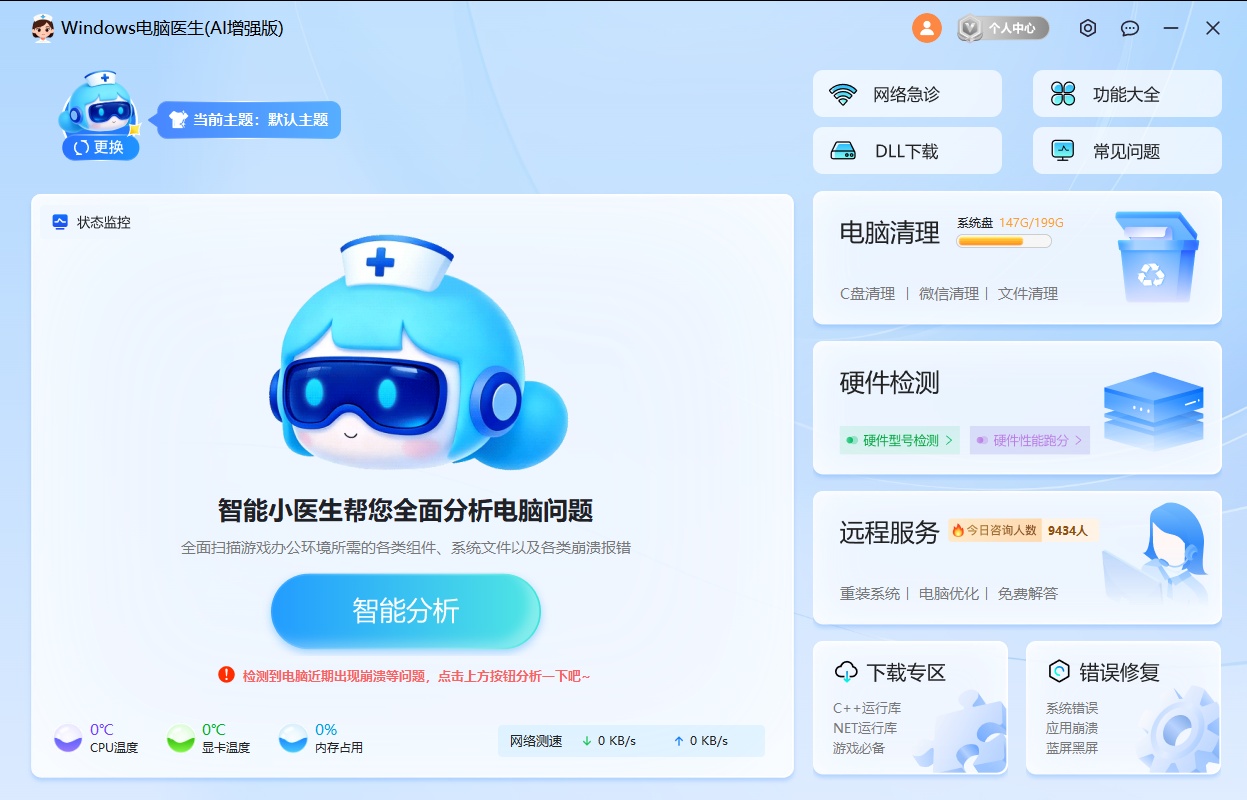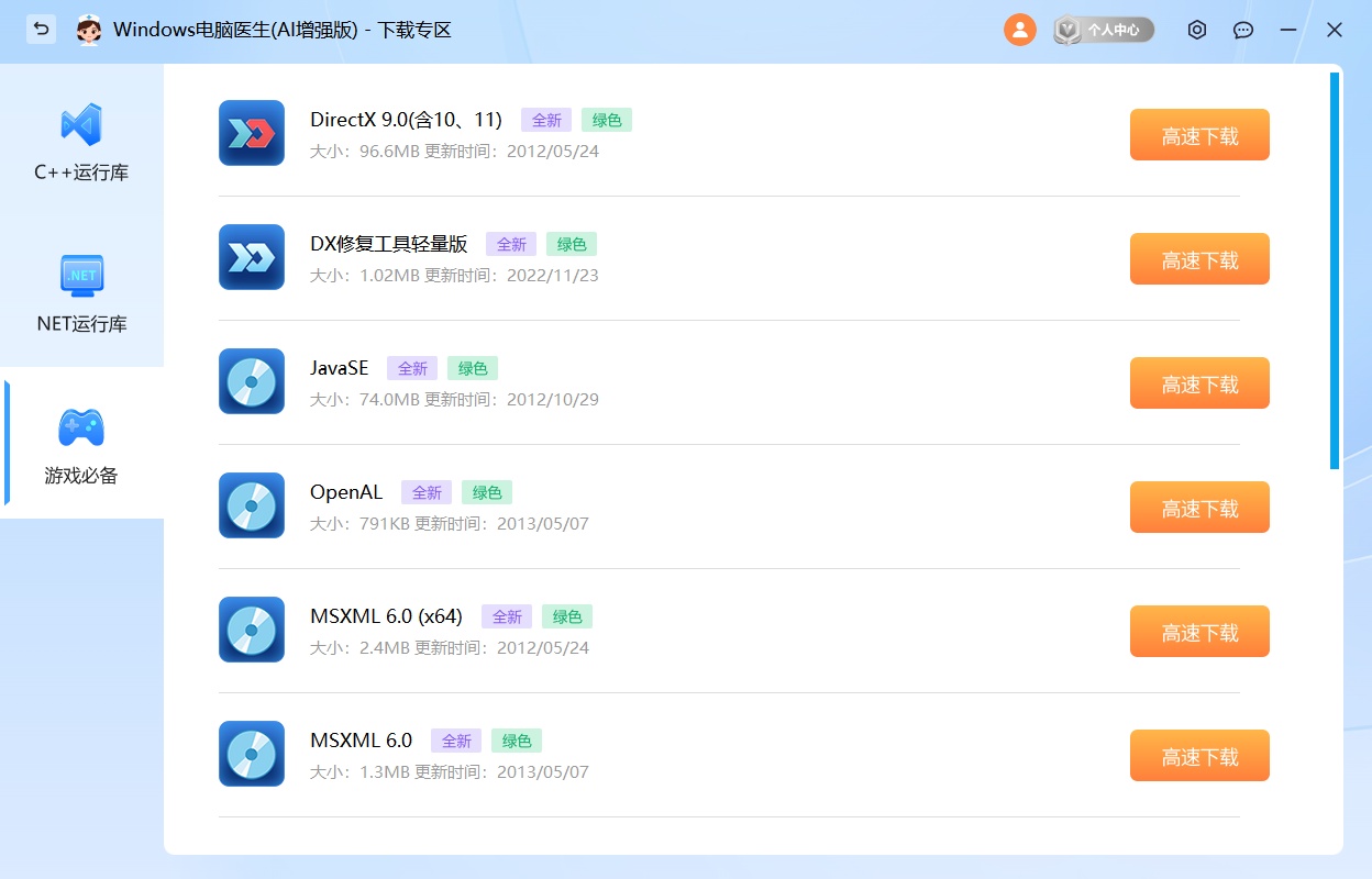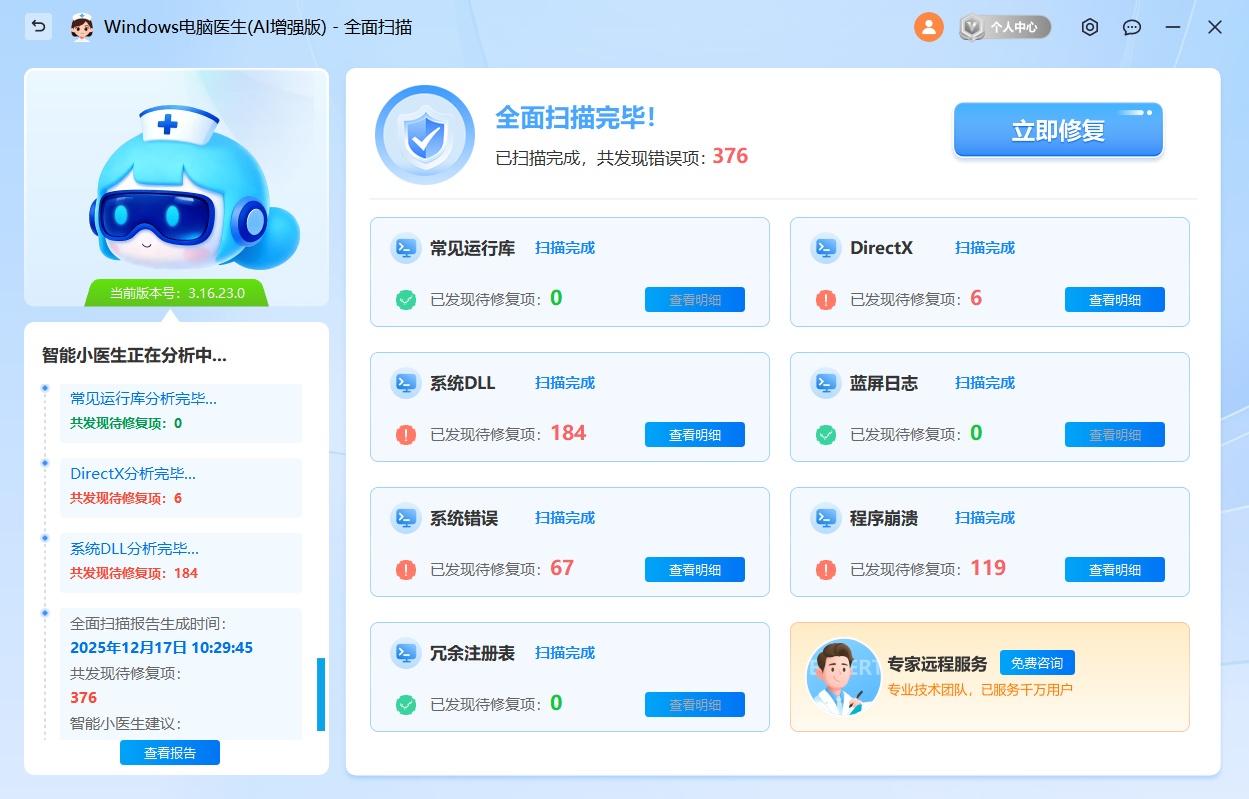 全面扫描:一键扫描检测系统异常,修复电脑系统运行库,优化系统运行环境