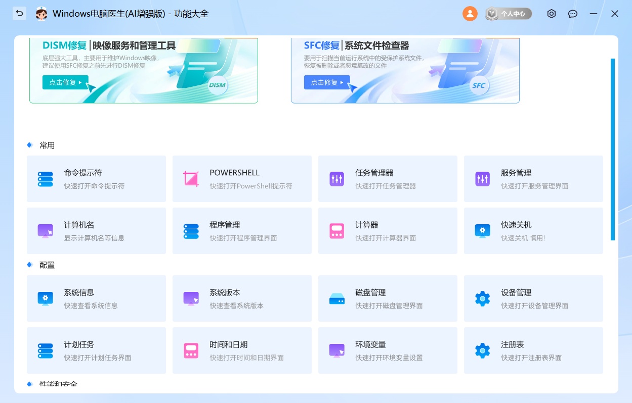 高级功能:SFC文件修复、DISM修复、打开注册表、环境变量、host文件。等等一系列Windows高级设置。